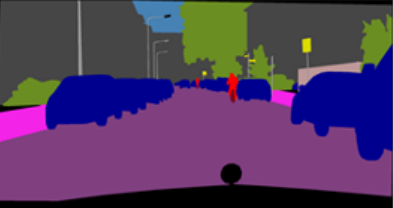下図の場合、道路が紫色、街路樹が緑色、車が青色、ビルや建物が灰色、など