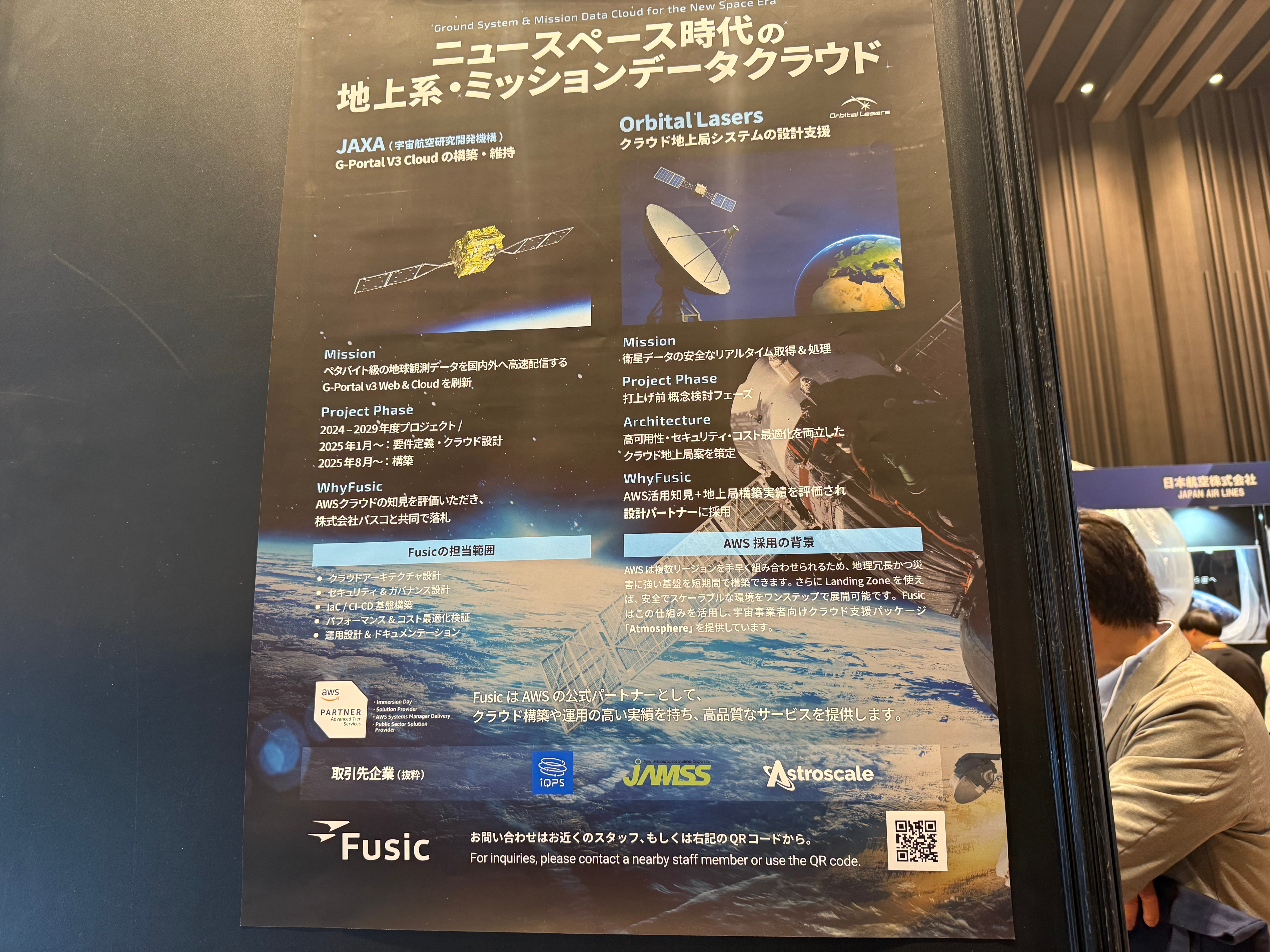ブースでは、JAXA「G-Portal V3 Cloud の構築・維持」におけるプロジェクト実績、AWSを活用した地上側システム開発の取り組みなどとともに、当社の宇宙ビジネスへの思いを様々な方とお話しさせていただきました。