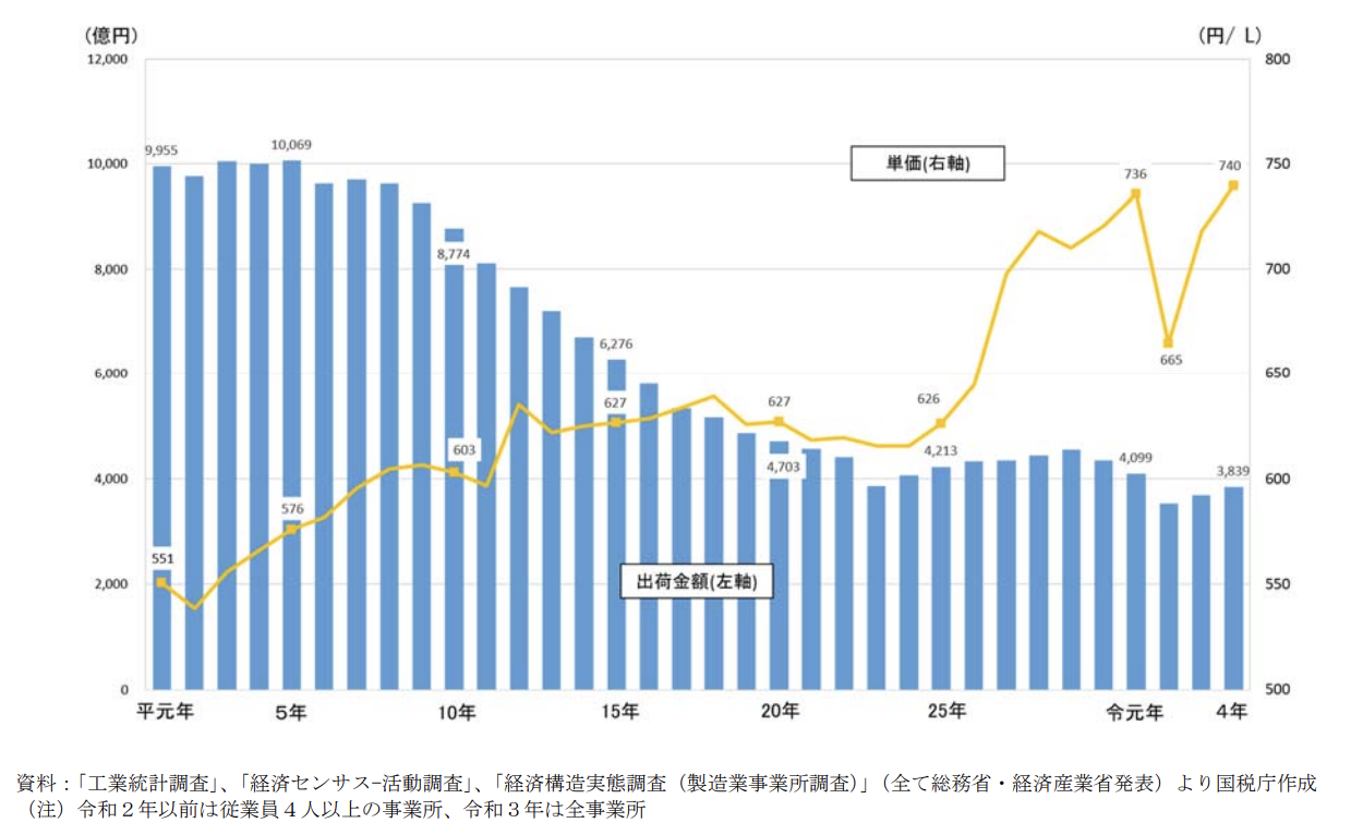 図4:日本酒国内出荷額と平均単価の推移