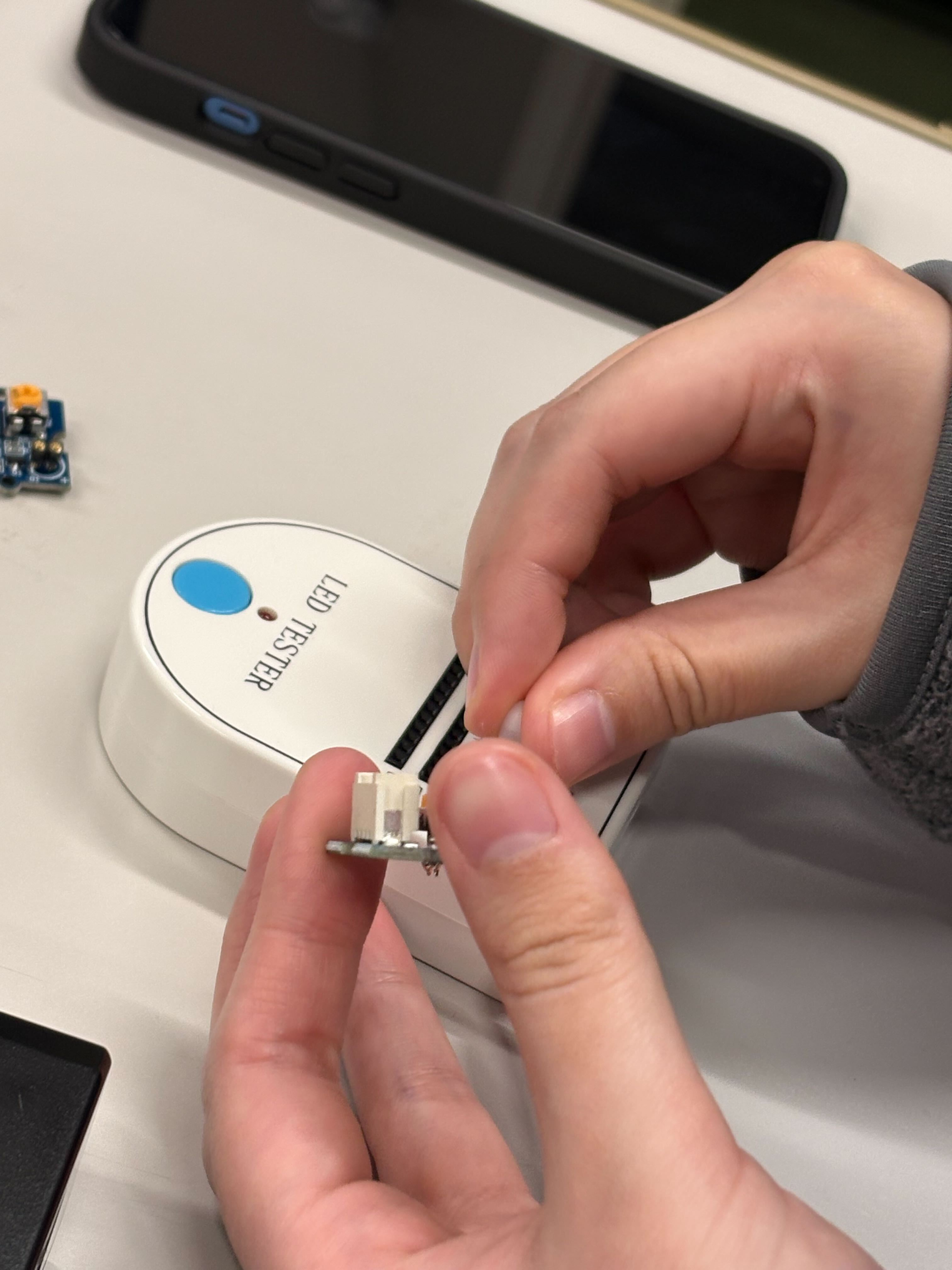 部品として使うLEDの向きを間違えないように、道具を使ってチェックを行います。