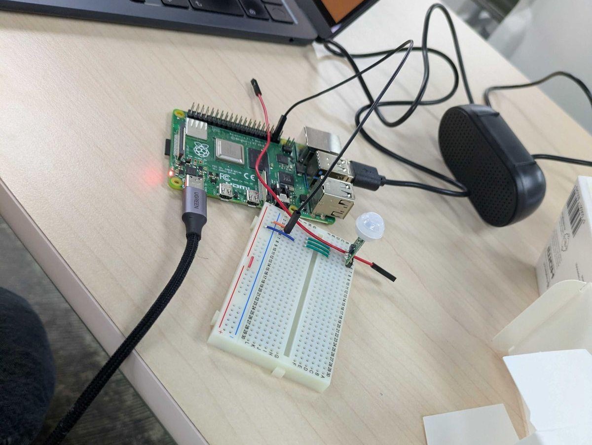 ↑センサーとマイクを組み合わせて、人が通ったら「ラズパイ、ワクワク」と話してくれます。