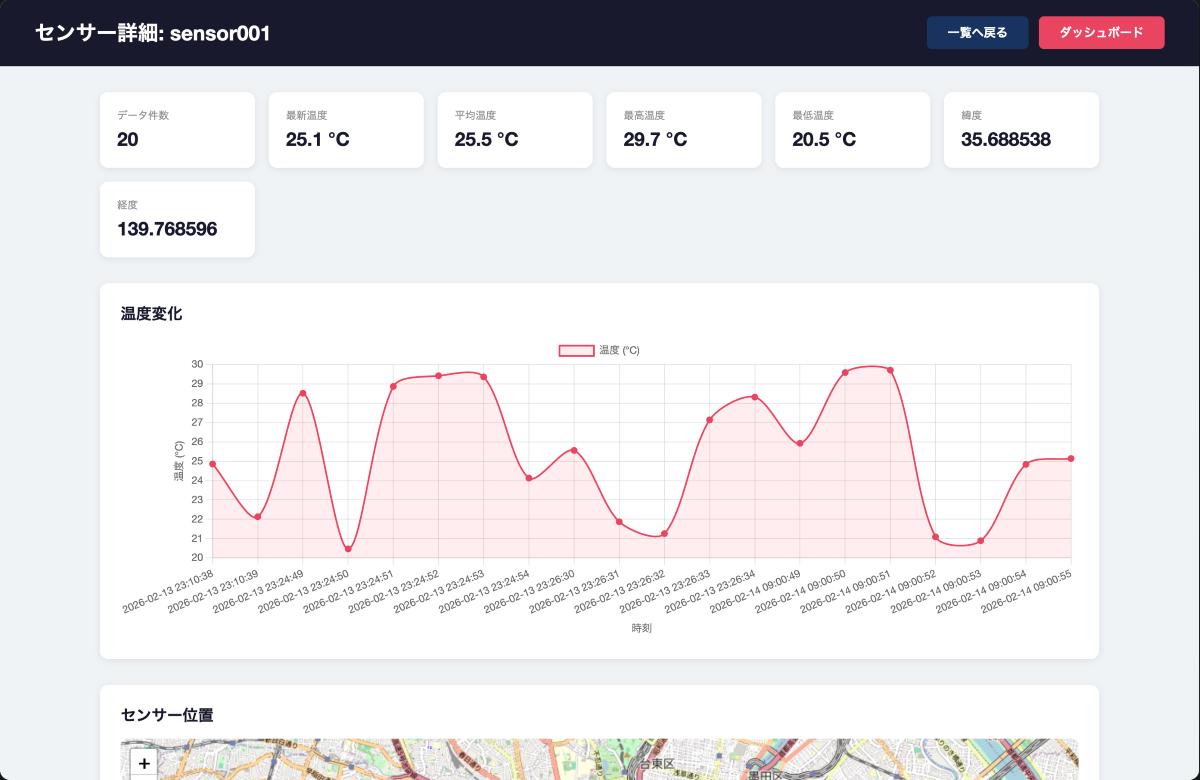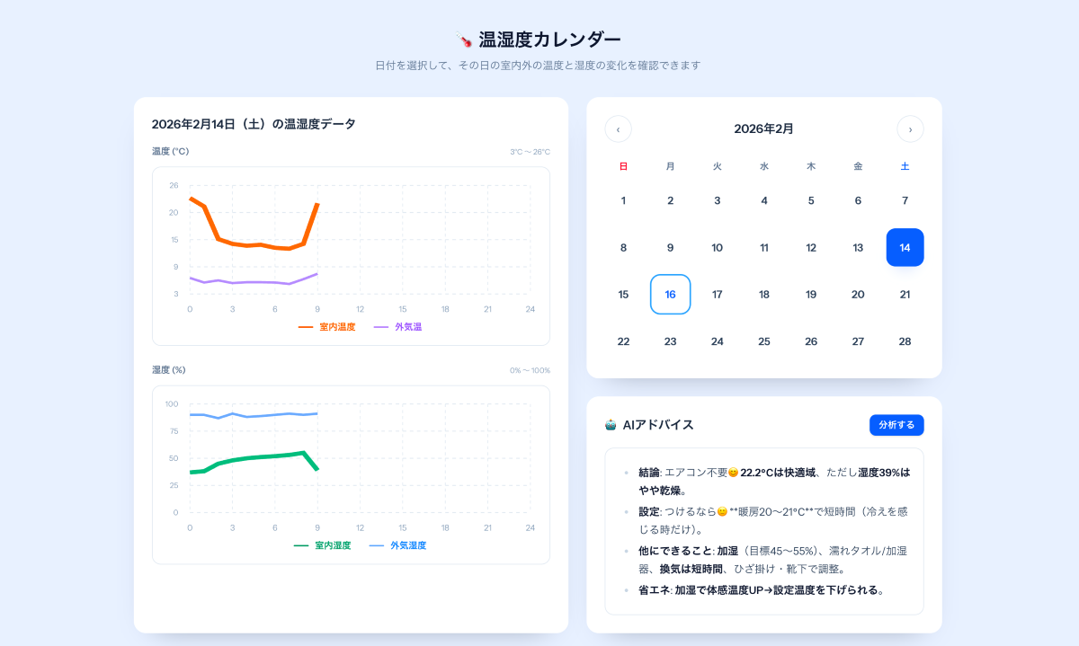 私は自宅から持ってきたSwitchBot Hub 2 (※2) から室内の温度、湿度を取得し、別途取得した室外の温度、湿度を可視化するWebアプリを作りました。