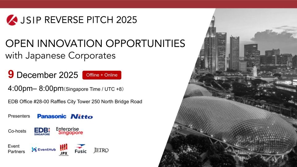 「JSIP REVERSE PITCH 2025」は、「日本と東南アジアをつなぐイノベーションの社会インフラ」を目指す共創型コミュニティである、JSIP(日本・東南アジアイノベーションプラットフォーム:Japan Southeast Asia Innovation Platform)が主催するイベントです。本イベントでは、パナソニック社や日東電工社をはじめとする日本の大手企業が、オープンイノベーション戦略やスタートアップとの協業テーマを紹介し、国境を越えた共創の機会を提供します。