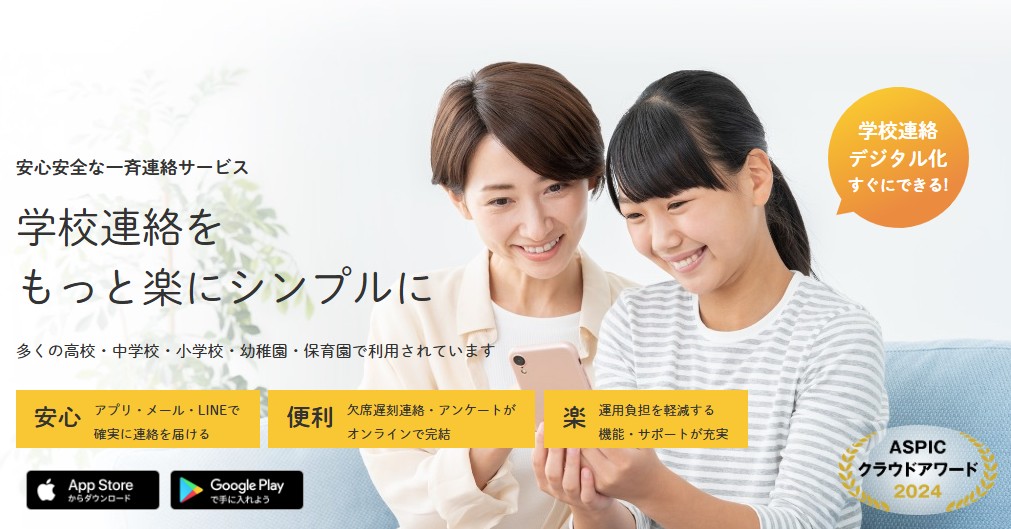 学校連絡をメールやスマホアプリといった複数の方法で、「安心」「便利」「楽」に受け取ることができるサービスです。